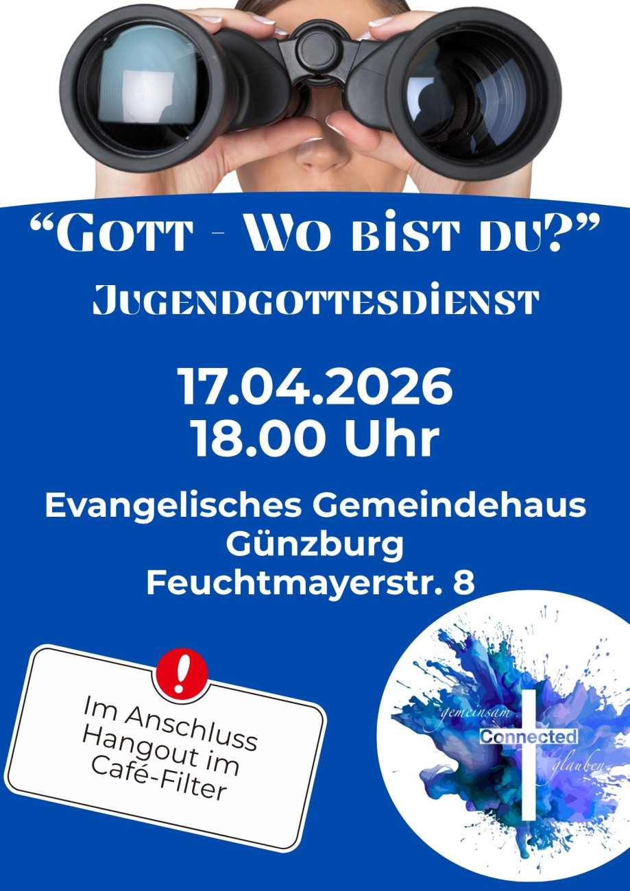 Herzliche Einladung zum Jugendgottesdienst "Connected" am 17. April um 18.00 Uhr in evangelischen Gemeindehaus. "Gott wo bist du?" Dieser Frage wollen wir gemeinsam nachgehen. Wo ist unser Gott in dieser Welt und in unserem Alltag. Warum ist es oft so schwer ihn zu finden und warum begenet man ihm manchmal an den Stellen, wo man ihn am wenigsten erwartet.